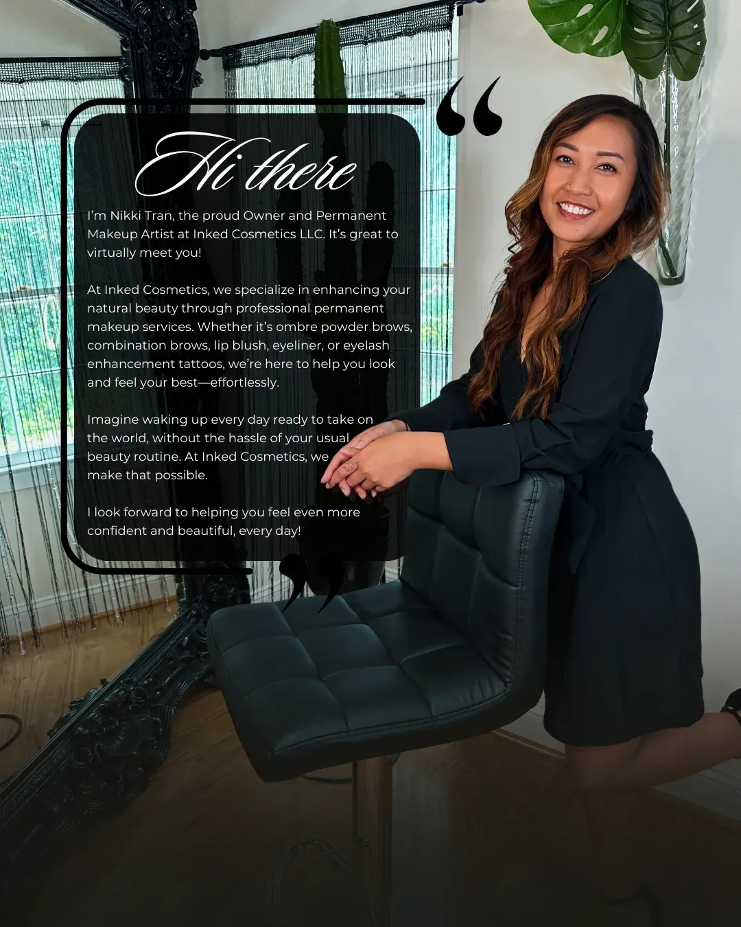 Nikki Tran is a highly skilled and internationally certified Permanent Makeup Artist who specializes in lip blush and ombre powder brow tattoos.